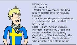 Zweden ... ooit de thuisbasis van de stoere Vikingen, nu het land van culturele marxistische mietjes. Als de ongezonde slingerbeweging naar de andere kant te lang blijft aanhouden, dan zal Zweden overgenomen worden door de veel stoerdere islamitische cultuur. De onderstaande beeldjes van "Captain Sweden" geven een zeer goed beeld van de huidige situatie: