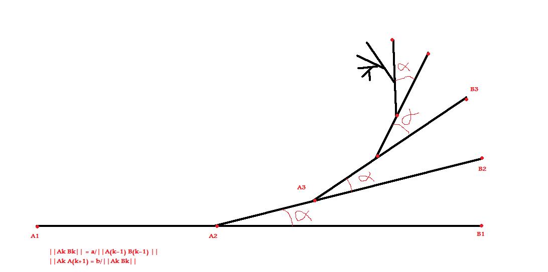 Dit gaat zo door voor eeuwig. Hoek Alpha is vast, de lijnstukken worden telkens verhoudingsgewijs kleiner, en het punt waaruit een lijnstuk vertrekt ligt verhoudingsgewijs op dezelfde plaats. De vraag: Voor welke waarden van a, b, Alpha kan deze constructie, indien k-> oneindig, bevat worden in een compactum zonder dat de lijnstukjes ooit elkaar snijden in meer dan 1 punt, namelijk het vertrekpunt Ak? Intuitief: het ding moet blijven doorgaan maar mag nooit botsen. |