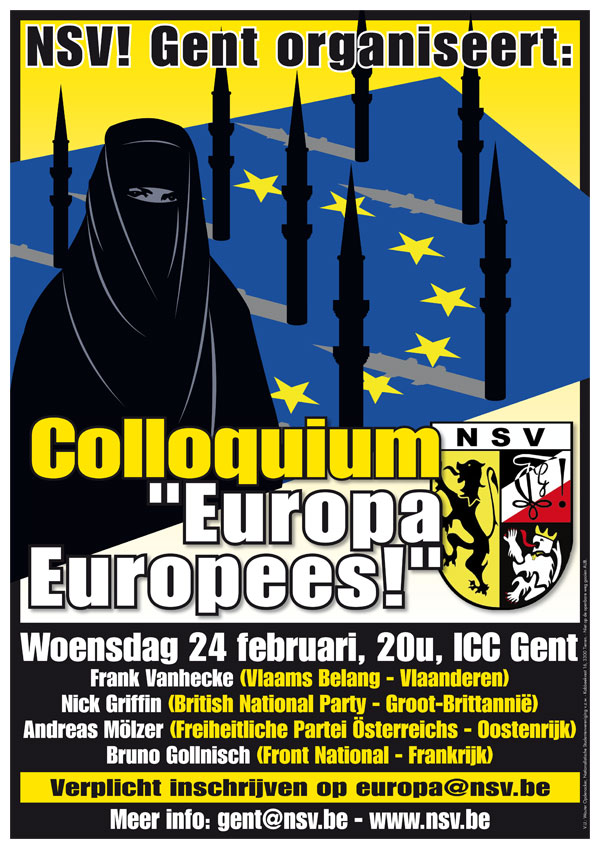 Op 24 februari 2010 zal de NSV! Gent een colloquium organiseren over de toekomst van Europa. Deelnemende sprekers zijn Frank Vanhecke (Vlaams Belang), Andreas Mölzer (FPÖ) Nick Griffin (British National Party) en Bruno Gollnisch(Front National). Dit colloquium zal aanvangen om 20u in het ICC van Gent. Let wel: Vooraf inschrijven is verplicht! Dit kan door je voor- en achternaam door te sturen naar: het e-postadres [email protected]