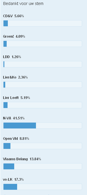 Schoon VoLK ook op de andere stadslijst, Lier & Ko. De VRT wierp zich voluit in de kiesstrijd met Bettina Geysen, die figureerde op een SP.A-Spirit lijst die zich niet zo durfde noemen (Lier Leeft!). Alles was nog peis en vree tussen CD&V en N-VA, of ze deden toch alsof. 0-VLD, SP.A, Spirit, CD&V, N-VA, Lier&Ko stapten samen in een anti Vlaams-Belang coalitie zonder veel programmatorische samenhang. De meerderheidspartijen verdeden het grootste deel van hun tijd met discussiëren over de Grote Knip, die Lier in een betere uitgave van Mortsel moest omtoveren. Het kartel CD&V-N-VA brak in 2010 definitief. De ex-voorzitter van de CD&V werd uitgebreid gehuldigd door diegenen die hem hadden buitengewerkt en stapte prompt over naar de N-VA. In het kader van de carrièreplanning van Els van Weert, verhuisde Spirit naar Groen, maar bleef in kartel met SP.A. Ondertussen zetelen 5 van de gemeenteraadsleden als onafhankelijke. Het mag gezegd: de dorpspolitiek in Lier is erg boeiend om volgen. Vraag is wat de burger daar ondertussen zo allemaal van denkt. De eerste poll is in ieder geval veelbelovend, de mensen schijnen te beseffen dat het tijd wordt om eens aan echte politiek te gaan doen. Bijlage 85262 |