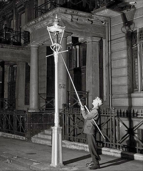 De echte lantaarnaanstekers kwamen bij valavond enkel met een stok en een soort lont. |