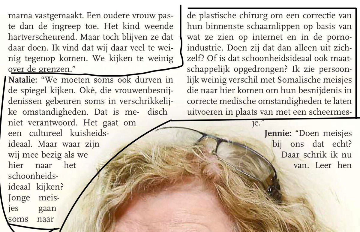 In feiten zegt ze dat besnijdenis nu eenmaal uitgevoerd wordt en dat het beter door een dokter gebeurd dan door een scheermesje in de derde wereld op de ene of andere keukentafel... |