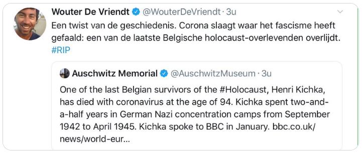 https://twitter.com/Rudpren/status/1254657113609175041 Bijlage 112215 (Intussen verwijderde hij zijn tweet) Kijk, ik wel zelfs advocaat van de duivel spelen en stellen (ben ik ook van overtuigd) dat er geen kwade intentie zit in zijn tweet. Nu los daarvan; en het feit dat zijn tweet wel heel snel weer weg was, maakt toch dat ook bij Wouter De Vriendt, 'communicatie' niet meteen de sterkste troef is. Dat je zoiets al neerschrijft; en op dergelijke manier meent te kunnen verwoorden. Twitter kennende, zal deze hem (en de partij) nog een tijdje achtervolgen. Vermoedelijk, zowat elke keer als hij naar de jaren '30 refereert. |