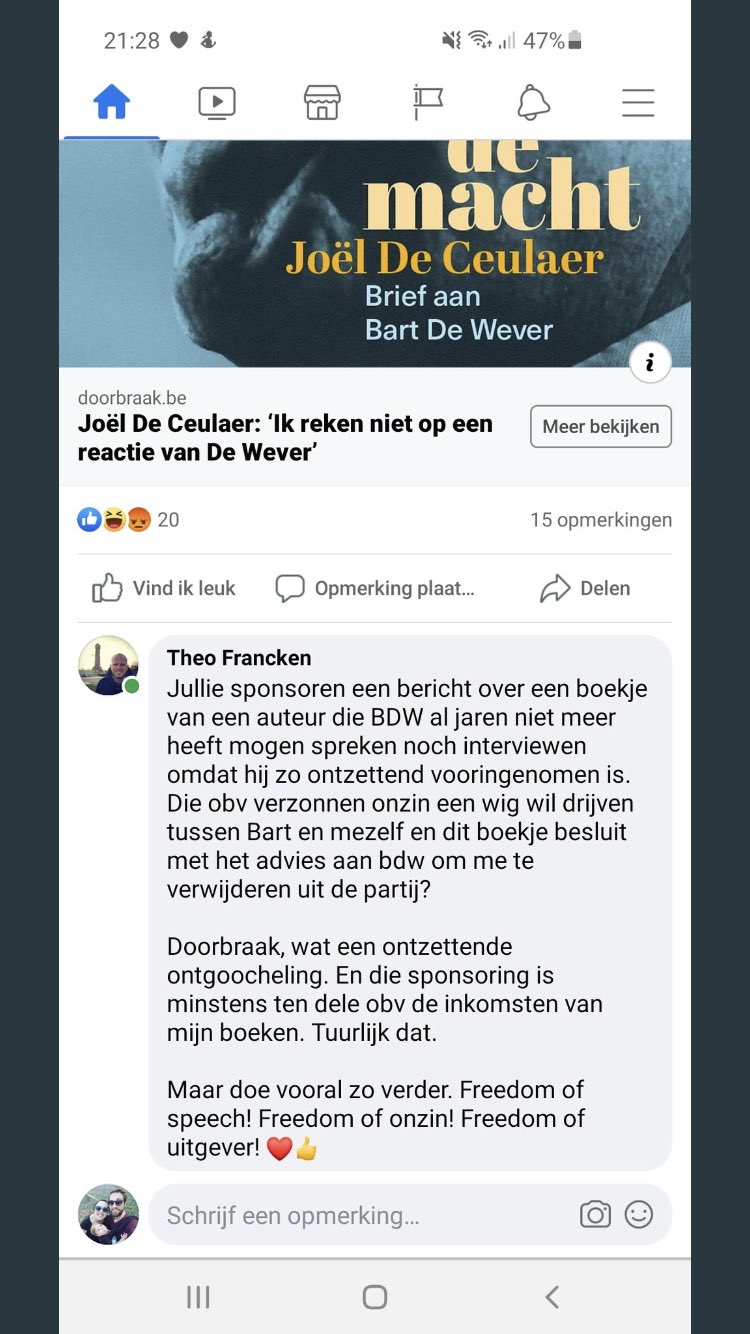 Bovenstaande tweet, betreft een in mijn ogen terechte reactie op een uithaal van Theo Francken jegens Doorbraak. Je kan niet langs één kant klagen over een gebrek aan objectiviteit bij de pers; en gelijk uithalen zoals Francken nu doet. Deze uithaal wordt niet gesmaakt. Bijlage 112334 |