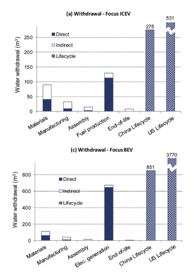 Uit LCA analyse van BEV's in Europa blijkt dat het waterverbruik van een BEV overeenkomt met 55 L per 100 km... en dat is enkel voor het gebruikersstadium, de winning van lithium en (toekomstige) lithiumrecyclingtechnieken zoals hydrometallurgische of elektrochemische recuperatie van lithium zijn slokoppen van water en steken niet in de berekening.