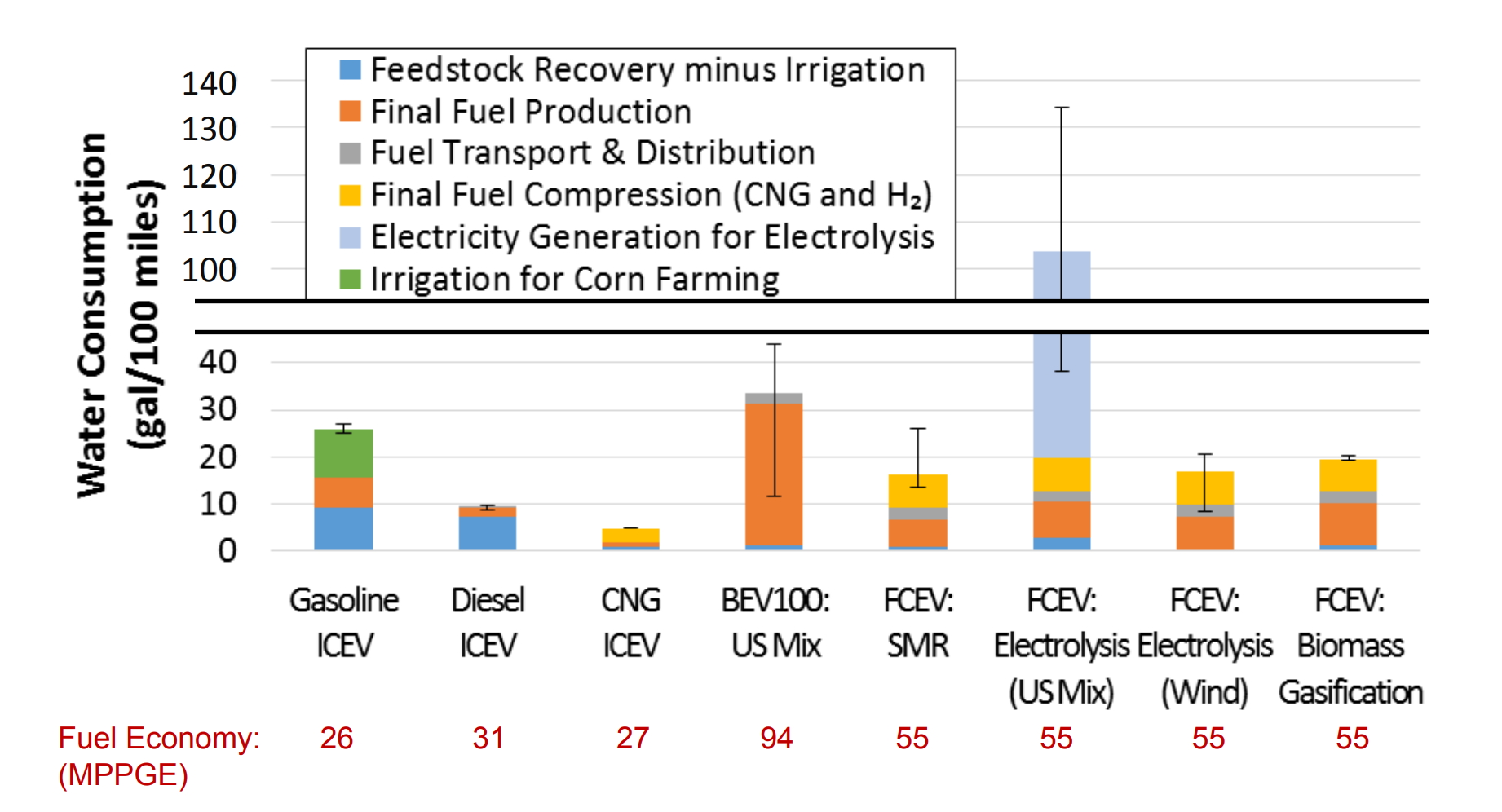 Andere studie, door Argonne Nat'l. Lab, hier komen ze op 80 L/100 km uit voor huidige BEV's - maar toegegeven, het waterverbruik (in het verbruikstadium) wordt in wezen bepaald door de manier elektriciteit wordt opgewekt... en een FCEV op groene waterstof verbruikt blijkbaar minder water dan benzine-ICE.