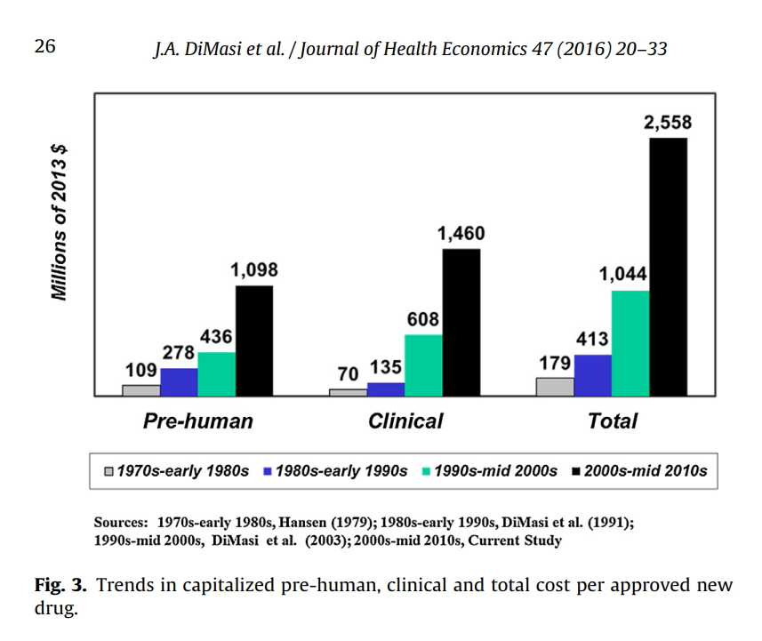 Een nieuw geneesmiddel ontwikkelen kost +/- 2.5 miljard USD, uitgesplitst in 1 miljard voor screening/preklinisch R&D en 1.5 miljard voor de klinische testen.