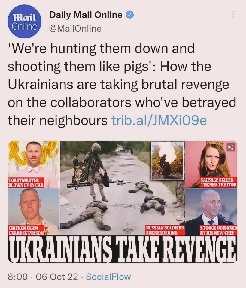 De Russen martelen gevangenen op wijzen waar de nazi's jaloers op zouden zijn. Inclusief martelkamers en het uitslaan van gouden tanden. Toch nog een gradatie. Oekrainers zijn niet lief. Russen zijn ontmenselijkte beesten. |