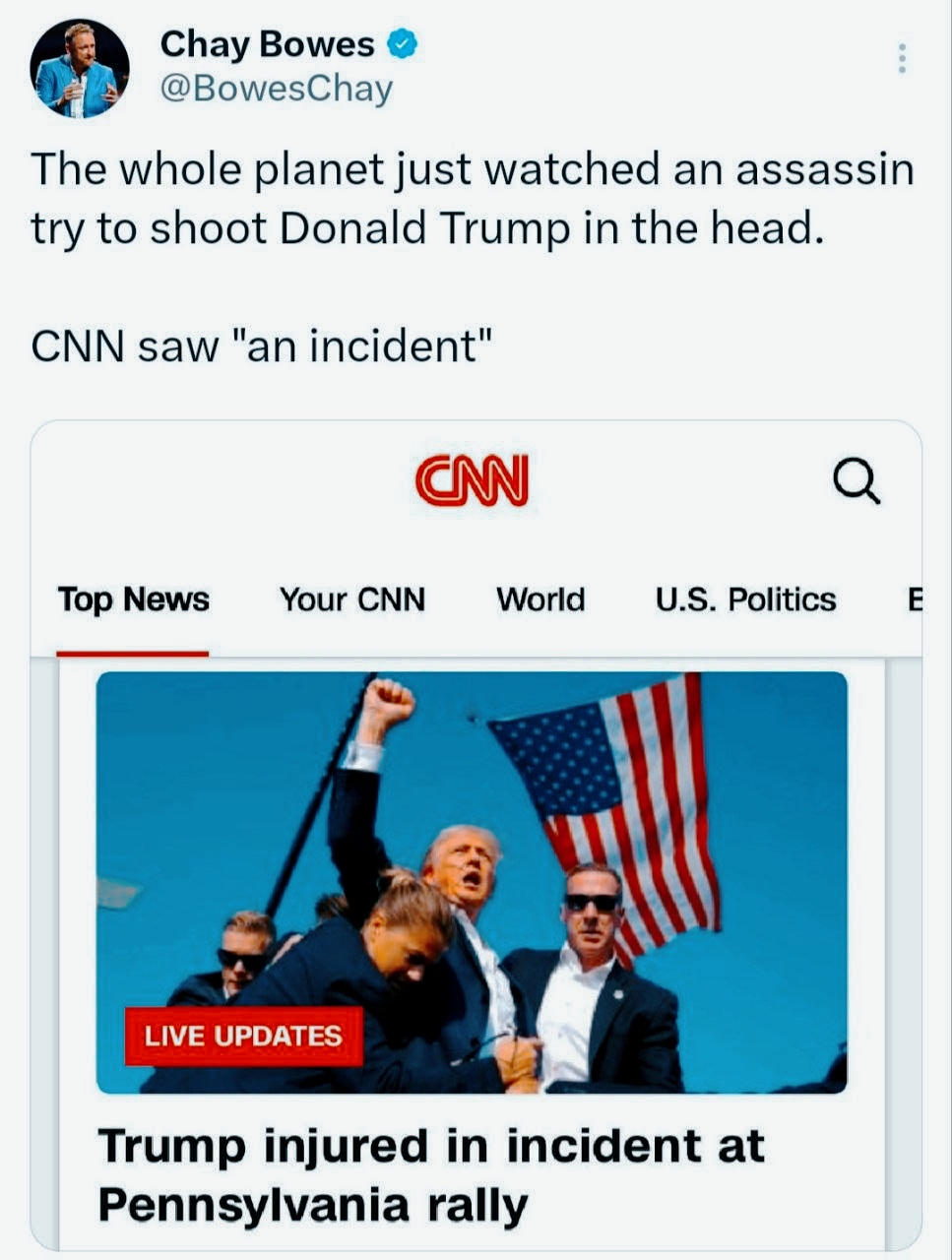 https://t.me/geopolitics_live/28726 Trump toont zich hier strijdlustig. Interessant te vergelijken met hoe bv. CNN dat brengt. Wat ze tonen en wat niet. Hier in ieder geval wordt dat niet getoond. Moest het Biden overkomen zou de titel heel anders klinken dan "Trump speech interrupted by Secret Service" gegarandeerd. Lijkt wel of ze het bloed niet gezien hebben. |