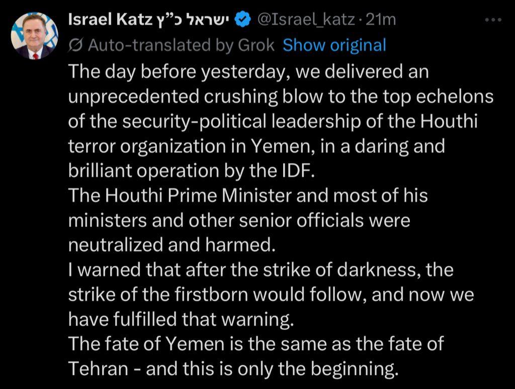 De Houthi's, een radicale antisemitische terreurgroep, hebben talloze raketten en drones naar Israël gelanceerd en schepen in de Rode Zee aangevallen tijdens de oorlog van Israël tegen Hamas in Gaza. Bron: i24News https://www.i24news.tv/en/news/middl...ther-ministers |