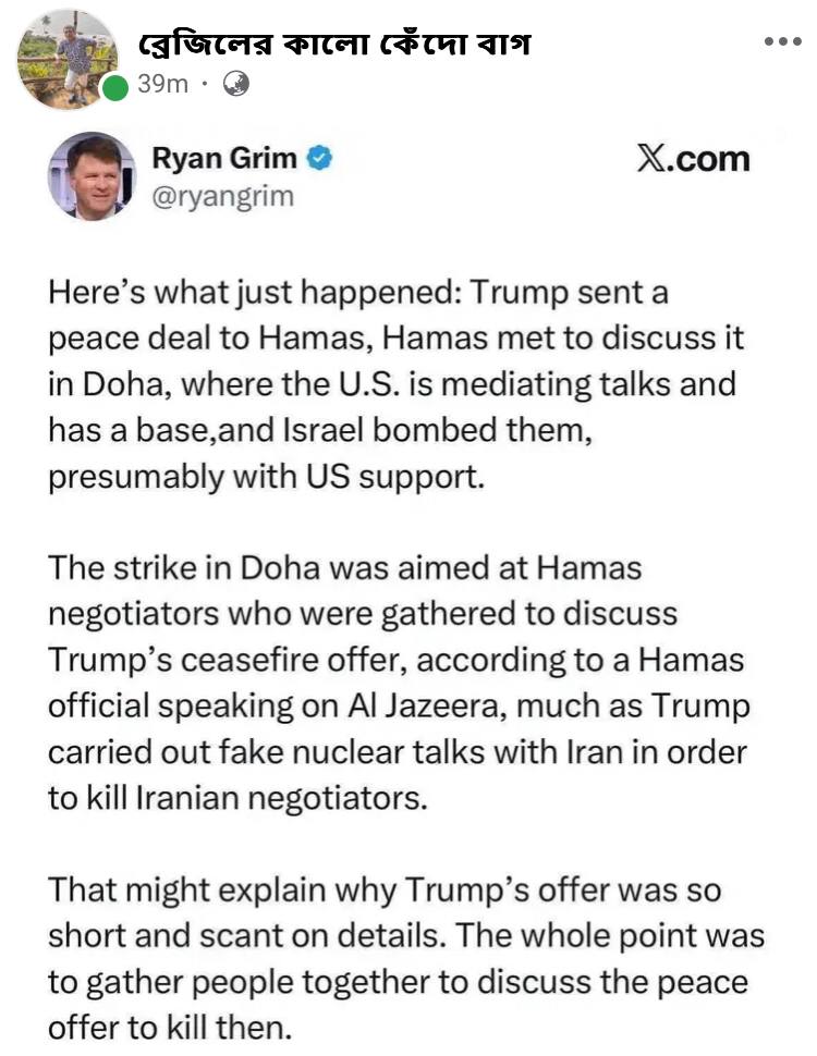 Israël bombardeerde Iran tijdens diplomatie, en nu Qatar. Het is duidelijk dat Israël geen vrede wilt. Succes tegen die miljarden als populatie van 30 miljoen... |