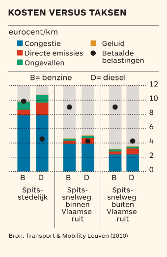 De bijgaande figuur geeft die externe kosten en betaalde belastingen in eurocent per kilometer voor enkele scenario’s weer. Merk hoe de benzinewagen in elk scenario meer belastingen betaalt dan de externe kosten die hij veroorzaakt. Een dieselwagen daarentegen betaalt tijdens de spits in de stad nog niet de helft van de externe kosten die hij veroorzaakt.