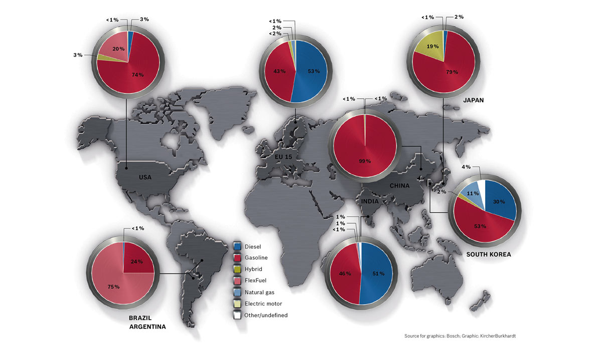 Maar daar halen ze veel minder winst uit. Het verdienmodel blijven ICE-wagens met wat hybride, als de batterijen maar klein blijven. Zo kunnen alle leveranciers van brandstofmotor-onderdelen en hun onderhoud (wisselstukken) ook overleven. Dus proberen ze de pure electrificatie wat af te remmen, maar dat gaat enkel in klein-EU lukken, imho. En de boemerang zal nog harder terugslaan... Doet me wat denken hoe ze indertijd de Japanse invasie van hybrides tegengehouden hebben met (kleine) dieselwagens, helaas is dat enkel in een groot deel van Europa gelukt. In de rest van de wereld wilden ze geen dieselpersonenwagens, enkel in kleine automarkten zoals Indië en Z-Korea was hun aandeel toen significant. Grafiek van Bosch, 2014, cijfers van 2013 of 2012, De prognose van Bosch was toen al dat de hybride of electrificatie zich langzaam maar zeker zou doorzetten, nu hebben we maar 11 jaar later. Citaat: