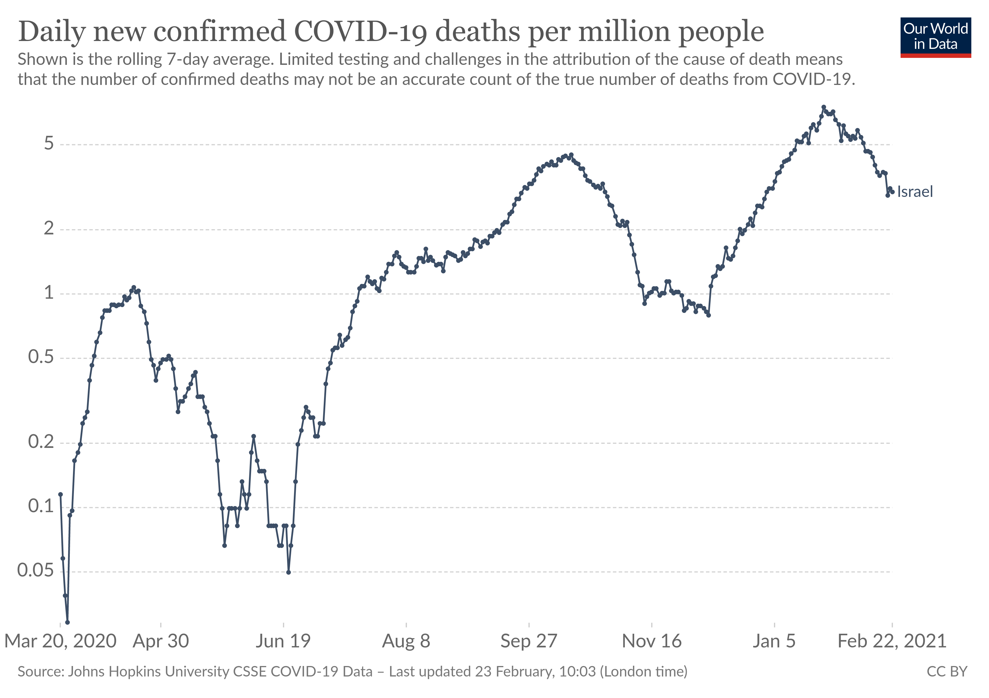 Het punt is gewoon dat in Israel al 90% van de kwetsbare bevolking al meer dan een maand werd ingeent, maar dat die fameuze 95% (delen door 20 he !) totaal niet zichtbaar is in hun cijfers. Eind januari vond ik dat te vroeg, nu, eind februari zou het effect heel erg zichtbaar moeten zijn. Het effect van vaccinatie op de landelijke dodencurve is zo goed als onbespeurbaar. Als je vergelijkt met de vorige lockdown zie je zo goed als geen enkel verschil in tendens. Ik vind dat eerlijk gezegd ongelofelijk teleurstellend en dat is niet ironisch, want ik denk dat de vaccins NU NOG hadden kunnen werken. Ik denk dat ze in november niet meer zullen werken, maar als ze dat nu al niet doen dan is het wel een nog veel zwaardere tegenvaller he. |