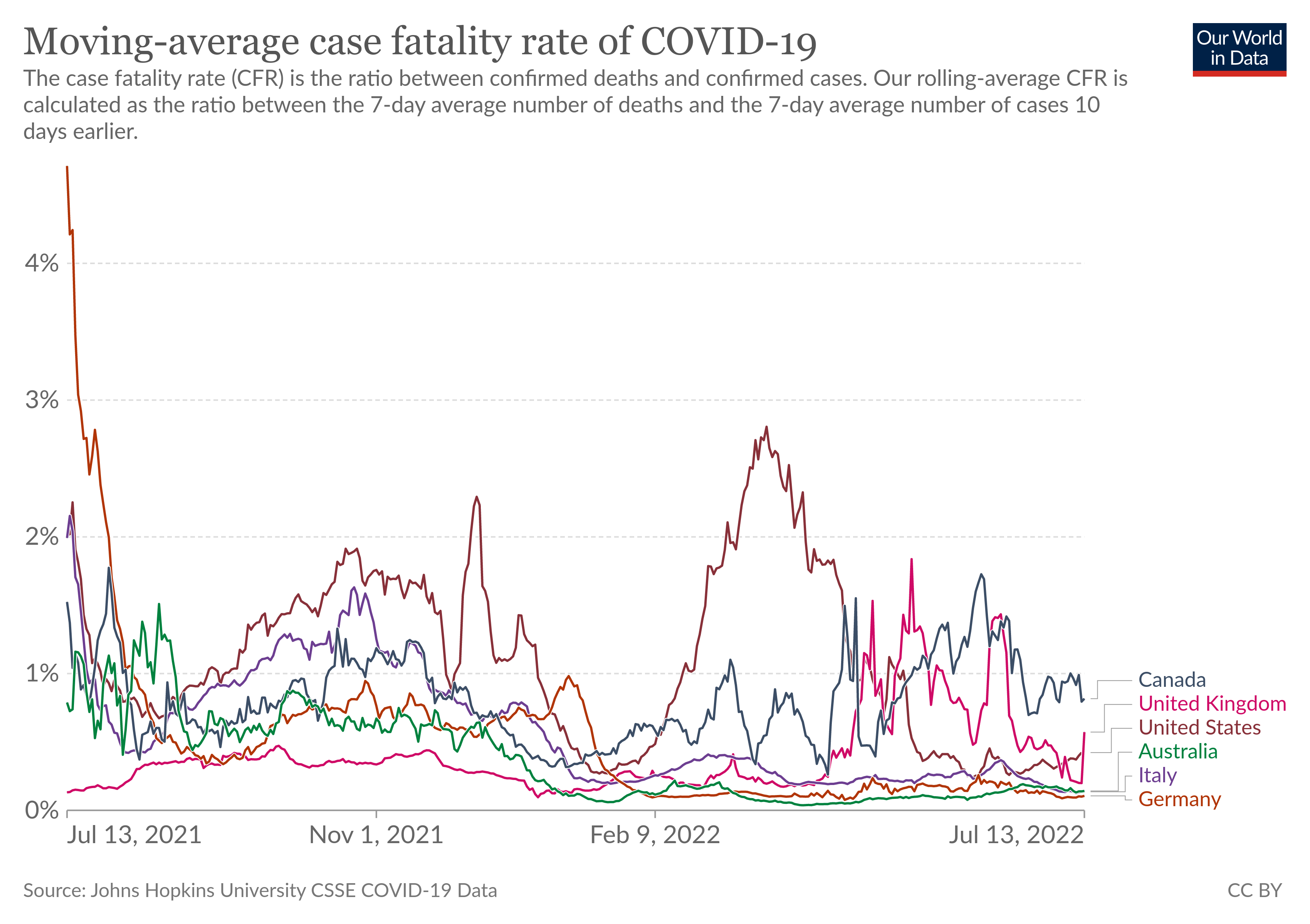 Als we naar de case fatality rate kijken, dan doet Australie het minstens even goed als elders. Natuurlijk is dat een grootheid die gevoelig is aan de test politiek: hoe minder je systematisch test, hoe hoger de CFR lijkt, vandaar dat die piekte toen er pieken waren (omdat we bij pieken meestal een kleinere fractie van de positieve gevallen waarnemen dan als we zonder "druk" testen). Het is eerder in Canada en de USA dat het "dodelijker" lijkt, maar dat komt misschien vanwege een minder grondige test politiek. De CFR is in elk geval heel laag. Van de orde van 0.2% |