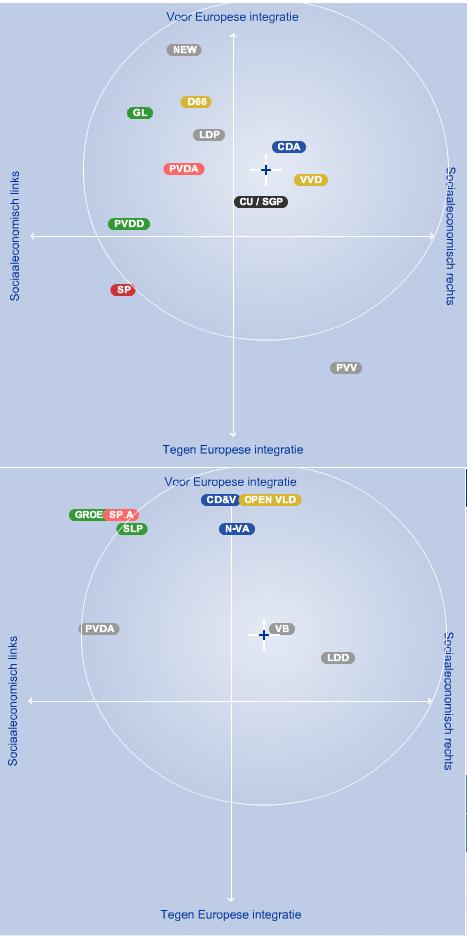 1. Open Vlaamse Liberalen en Democraten 91,1% 2. Nieuw-Vlaamse Alliantie 67,9% 3. Christen-Democratisch & Vlaams 72,5% 4. Socialistische Partij Anders 76,9% 5. Sociaal-Liberale Partij 75,9% 6. Groen! 72,3% 7. Vlaams Belang 64,3% 8. Lijst Dedecker 62,5% 9. Partij van de Arbeid 54,2% In Nederland: 1. Democraten 1966 82,1% 2. Christen-Democratisch Appel 75,8% 3. GroenLinks 75,4% 4. Newropeans 74,4% 5. Liberaal Democratische Partij 72,7% 6. Partij van de Arbeid 69,6% 7. Volkspartij voor Vrijheid en Democratie 68,3% 8. ChristenUnie/Staatkundig Gereformeerde Partij 62,5% 9. Partij voor de Dieren 49,6% 10. Socialistische Partij 45,0% 11. Partij voor de Vrijheid 35,3% Pan-Europees: 1. Evropska demokraticka strana 96,1% 2. Open Vlaamse Liberalen en Democraten 91,1% 3. PD+SPDL+Zieloni 2004 89,3% 4. Nieuw-Vlaamse Alliantie 67,9% 5. Christen-Democratisch & Vlaams 72,5% 6. Tautas Partija 85,9% 7. Union pour un Majorite Populaire 85,0% 8. Italia dei Valori 84,1% 9. Strana zelenych 83,9% 10. Movimento Merito e Soceidade 83,8% Kortom het zal waarschijnlijk D66 worden (nationaal zit ik meestal ergens tussen D66 en VVD in, een soort progressief rechts, maar vanwege het Europa-standpunt valt de VVD al af).