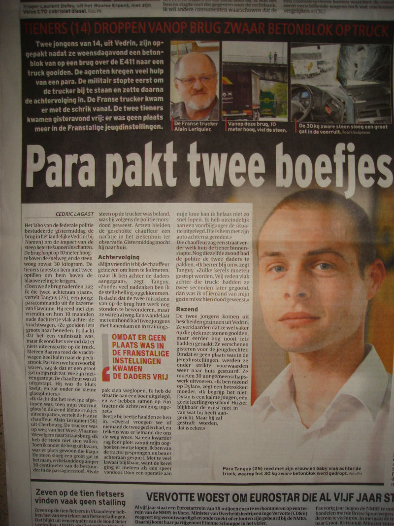een "steentje" van meer dan dertig kilo door een voorruit kwakken, dat zijn geen "boefjesstreken" meer, maar gewoon een moordpoging.