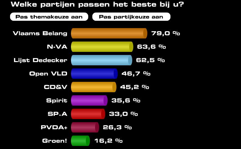 En de mijne. Ben zo te zien een VB'er. De NVA zou me ook wel liggen. En ik had niks gehad tegen de CD&V als het niet zulke tsjeven waren.