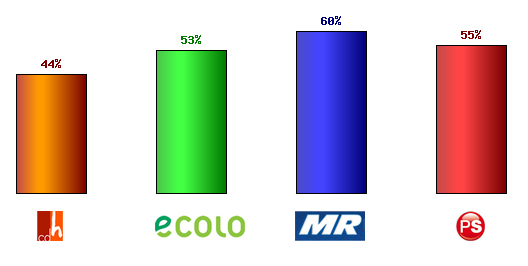 1. Ecolo (66%) 2. CDh (64%) 3. MR (60%) 4. PS (57%) |