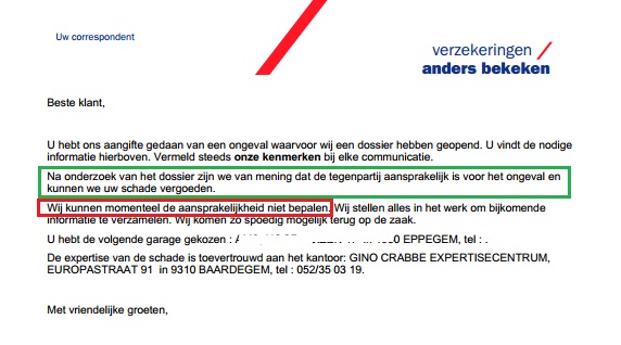 Maar hoe kan de verzekeringsmaatschappij spreken over een ongeval, de schuld kan opzettelijk zijn, b.v om de verzekeringsmaatschappij op te lichten. Daarom zou de V.M. beter spreken over een incident, dan kan het nog alle kanten uit. Hoe kunnen ze na een onderzoek bepalen dat de andere schuldige is van het ongeval? Een ongeval is immers een plotseling optredende, ongewilde en onvoorziene gebeurtenis, waarbij de inwerking van een externe oorzaak leidt tot een ongeval? Een ongeval is daarbij ongewild en onvoorzien, van een schuldige is geen sprake. En dan stellen ze dat de aansprakelijkheid niet kan bepaald worden? En stellen ze alles in het werk om bijkomende informatie te verzamelen. Wat is er dan mis met het onderzoek waarmee ze de schuldige al bepaald hadden? Van heel die mail/brief klopt geen kl*t*en.
