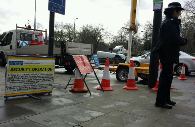 euronews - Blair warns Syria conflict could spread outside region (+Video) Telegraph - Terror chief warns of threat from Syria jihadists 23 januari 2014 - British Muslims fighting in Syria are highly likely to attempt terrorist attacks on British soil, the country’s most senior counter-terrorism police officer has warned. Commander Richard Walton, head of Scotland Yard’s counter-terrorism unit, said it was “almost inevitable” that a Briton currently involved in the conflict would eventually attempt on outrage against this country or another Western target. He warned that a “shocking” number of British children are being lured into the conflict, and disclosed two teenage girls were arrested attempting to travel to Syria earlier this month, although no charges were brought. “All our experience around Afghanistan is that if British Muslims get trained in camps they become a very real threat because the al-Qaeda narrative extends to Western attack. It’s almost inevitable,” Mr Walton told the Evening Standard. _________________________________________________ Vandaag: Willekeurige 'Stop & Search' in Londen Infowars - Papers Please: Checkpoints in London ‘Because Terrorism’ 24 januari 2014 - “Police activities, including stop and search, will make it harder for terrorists to operate. Your co-operation and patience will help keep London safe.” Informatie bij afbeelding 1: "geblokkeerd voetpad" (klik op de foto om te vergroten): |