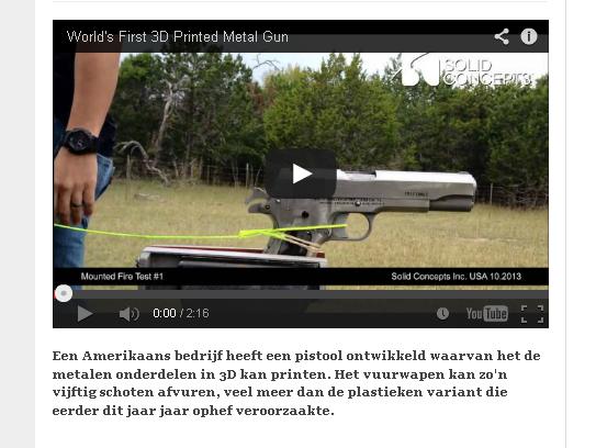 Ik heb het nu niet over het wapen zelf maar over de techniek die er sowiezo aankomt. Wie kan inschatten wat dit gaat teweeg brengen? Wat als je morgen al het materiaal dat je nodig hebt uit een 3D printer haalt? Benodigde kennis en onderdelen via internet op de keukentafel. Enkele grote grondstoffenleveranciers en dat is het? |