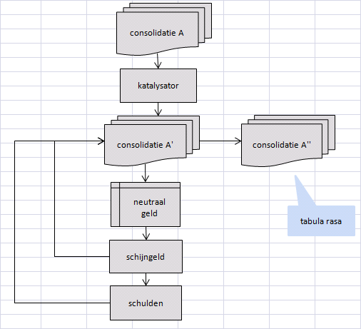 Ook in dit schema zien we dat alle schulden tot nihil herleid werden zonder de reële economie te raken. Zuiver economisch bestaat er dus geen reden om deze last op de schouders van de bevolking te leggen. In reflectie tot de beleidsmaatregelen van alledag hebben we dan een verklaring nodig waarom deze last wel op de bevolking wordt afgewenteld. Iemand een idee wat deze verklaring zou kunnen zijn?