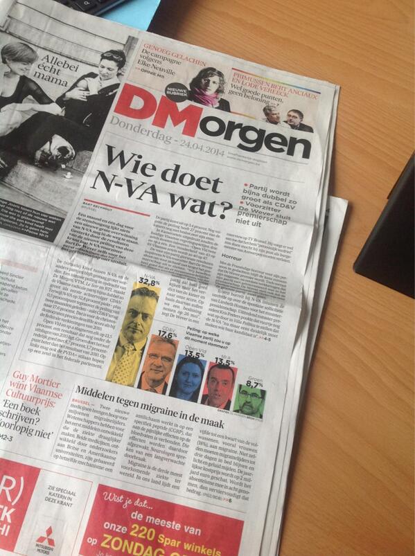 ![]() blijkbaar kennen de n-va ers de voorpagina van de morgen niet ...dewever is daar nochtans columnist geweest.