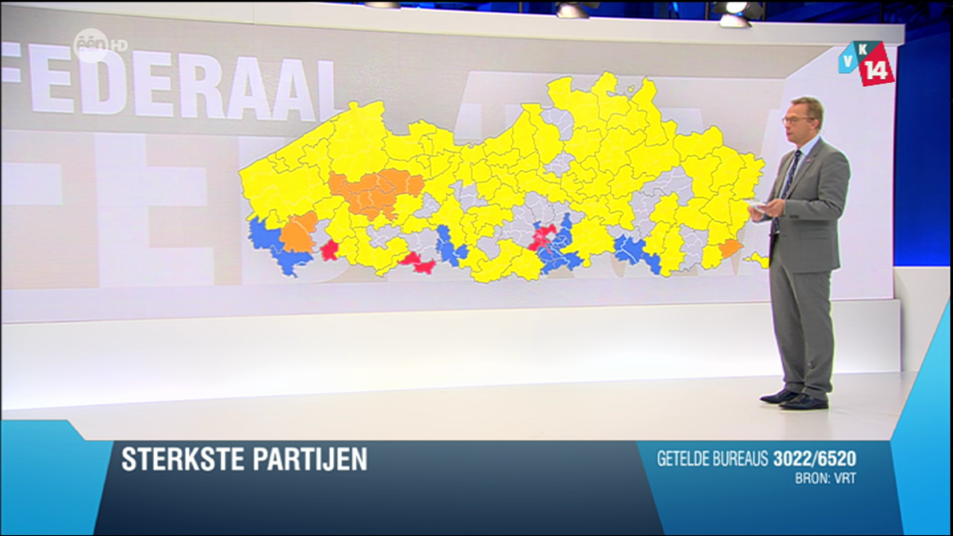 ![]() Nva haalt voorlopig boven hun doelstelling: 33 - 34 %, wel ten koste van vb die bestaan zo goed als niet meer... De traditionele partijen houden stand dus nva is eigenlijk niet incortounable geworden, men kan nog steeds zonder nva een federale regering vormen.