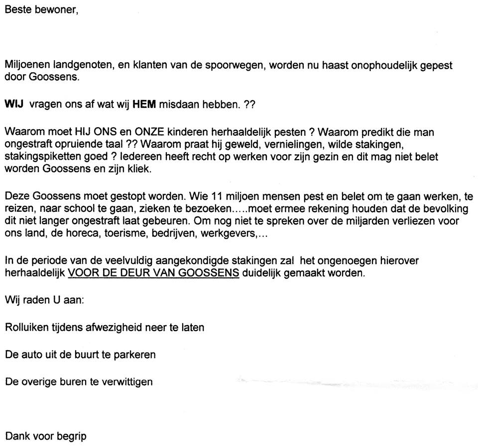 Dit doet de ronde via mail: een brief aan de buurtbewoners van Goossens van de acod van de nmbs.