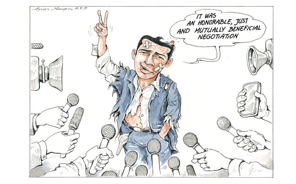 ![]() Natuurlijk heeft hij verloren. Ik hoorde deze morgen dat van een onmiddellijk akkoord omtrent schuldverlichting volstrekt geen sprake is. Pas wanneer na enkele maanden blijkt dat er van het opgelegde programma wel degelijk werk wordt gemaakt zal het item "schuldverlichting" op de agenda worden geplaatst. Tsipras werd geketend aan enkels en polsen. Maar nu zal hij natuurlijk tegenover het parlement in Athene weer eens zijn socialistische gezwollen slogans bovenhalen en beweren dat de "waardigheid" van de Grieken stand heeft gehouden.