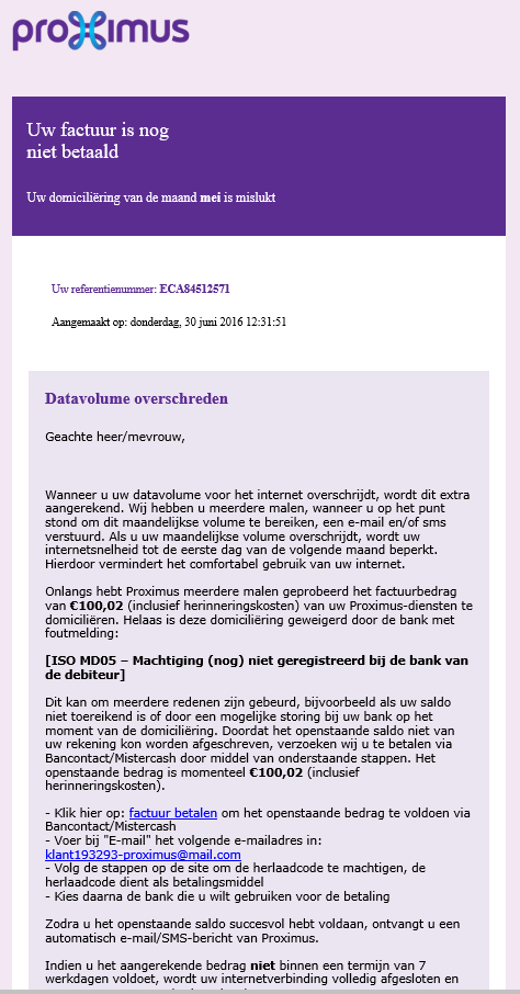 maandag 20 juni 2016 Moet betaald worden via bitcion, dan weet men het wel. woensdag 22 juni 2016 Ze worden steeds professioneler, heb die mail laten tonen bij mijn bank en die bediende dacht eerst dat het om een legitieme mail ging. Bij nader onderzoek bleek het een vorm van phishing te zijn. Onmiddellijk gemeld aan kbc secure Hun antwoord: Bedankt voor uw melding. Uw alerte houding is terecht. Dit is inderdaad een valse e-mail die niet door KBC, maar door oplichters werd verzonden. We doen het nodige om deze vorm van internetcriminaliteit te bestrijden. Gelieve onderstaand duiding en nuttige informatie te willen vinden: PHISHING Steeds vaker proberen internetcriminelen via valse e-mails en websites mensen te misleiden tot het overhandigen van persoonlijke informatie. Deze vorm van internetcriminaliteit wordt phishing genoemd. Er is momenteel een valse e-mail in omloop waarbij in naam van KBC -omwille van een zogenaamd “beveiligingsprobleem”- wordt gevraagd om persoonlijke informatie (naam, adres, telefoonnummer, kaartnummer van uw bankkaart, …) op een vervalste KBC-website in te voeren. Opgelet! Met deze codes kan de internetcrimineel eenvoudigweg aanmelden en vervolgens een frauduleuze overschrijving handtekenen. Waar moet u op letten? • Geef nooit telefonisch de codes van uw kaartlezer door. Die responsecodes zijn even geheim als de pincode van uw bankkaart! • KBC zal u nooit via e-mail contacteren met de vraag om persoonlijke informatie door te geven omwille van een ‘beveiligingsprobleem’. Hebt u toch zo’n mail ontvangen, dan weet u per definitie dat deze niet van KBC afkomstig kan zijn. • KBC zal u nooit telefonisch contacteren met de vraag om responsecodes door te geven. Ontvangt u toch zo’n telefoontje, dan weet u per definitie dat u geen KBC-medewerker, maar een oplichter aan de lijn hebt. Twijfelt u, onderbreek dan het telefoongesprek en contacteer zelf via de gebruikelijke weg uw KBC kantoor. Wat moet u doen? • Verwijder de e-mail. Klik niet op een link in de e-mail, zelfs al lijkt het erop alsof deze naar de echte KBC-website verwijst. • Hebt u vanuit de e-mail toch op een link geklikt, voer dan op de vervalste KBC-website in geen geval uw persoonlijke gegevens in. • Hebt u toch uw persoonlijke gegevens op een valse KBC-website ingevoerd of hebt u telefonisch responsecodes doorgegeven, contacteer ons dan onmiddellijk op het telefoonnummer 0800 65 65 0. Dat kan elke dag, de klok rond. Meer informatie vindt u op www.kbc.be/secure4u