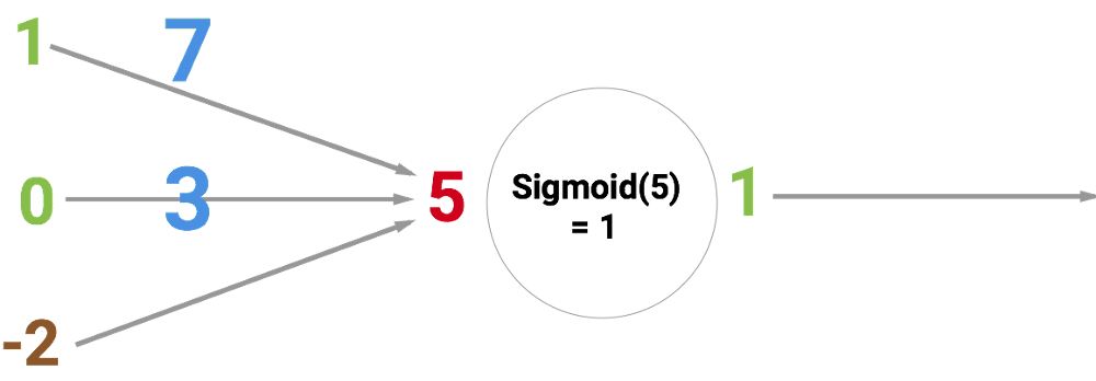 The neuron then performs some kind of computation on this number — in our case the Sigmoid function, and then spits out an output. This happens to be 1, as Sigmoid of 5 equals to 1, if we round the number up (more info on the Sigmoid function follows later). If this was a spam filter, the fact that we’re outputting 1 (as opposed to 0) probably means that the neuron has labeled the text as ‘spam’.