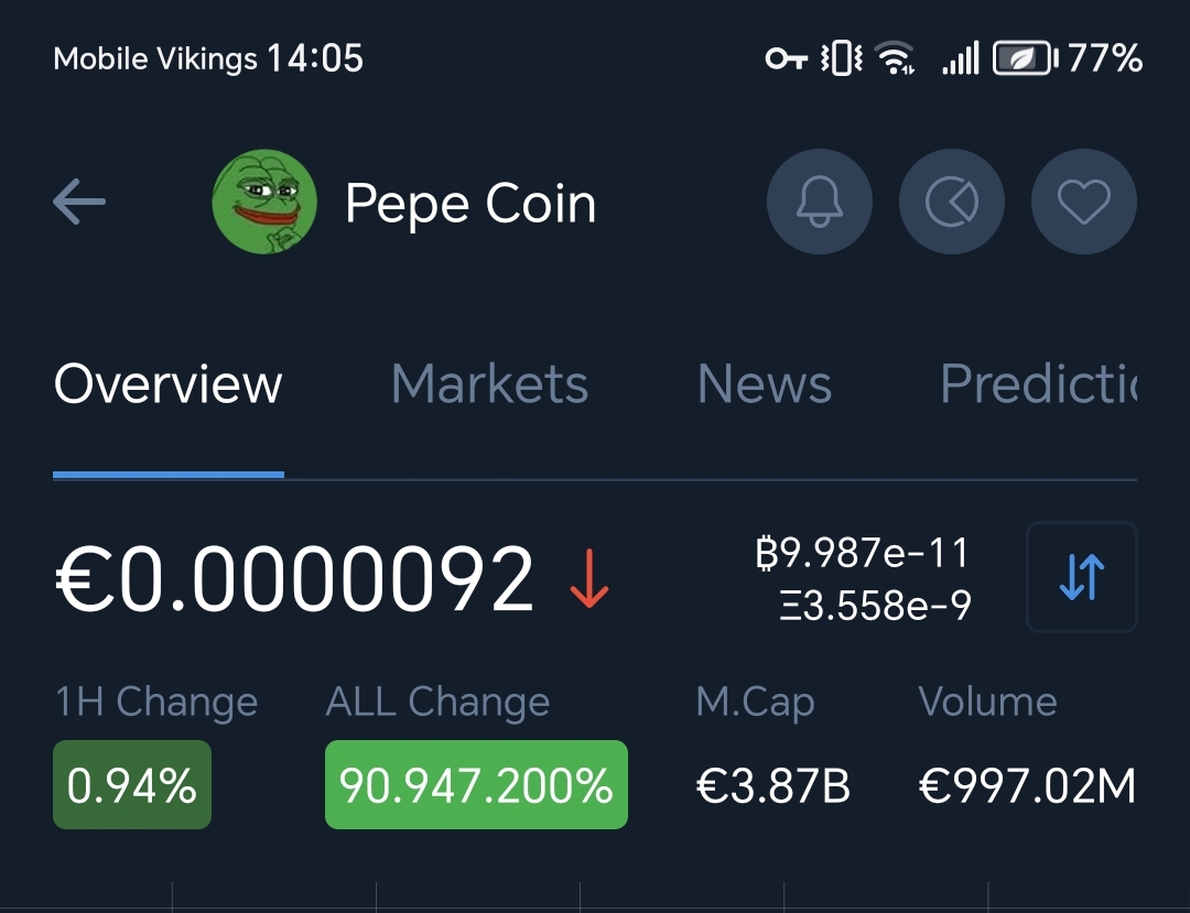 Neem nu Pepe, die is over zijn hele loopbaan bijna 100 miljoen procent gestegen. U leest het goed, bijna 100 000 000% gestegen. Wie dus 100 euro inlegde in het begin en die bijhield, is nu bijna miljardair. Zelfs vandaag worden daar op een futures duizendtallen euro's per trade behaald. Ik zoek een soortgelijke... Als een paar gedreven mensen de koppen samen steken, is the sky the limit.