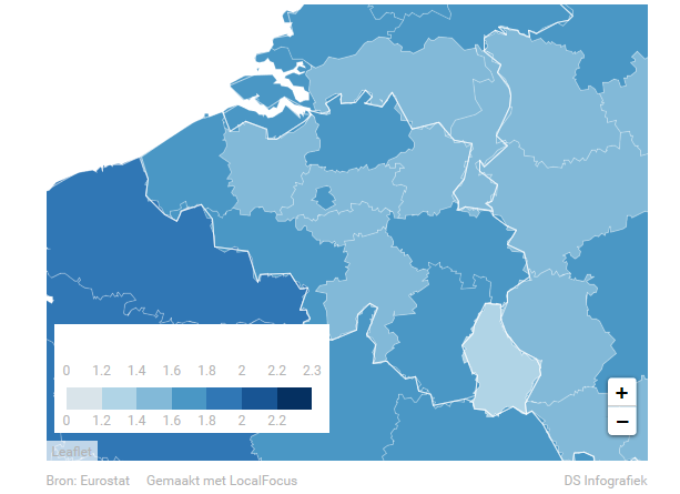 Europa en fertiliteit Aantal levendgeborenen per vrouw in 2018 Limburg 1,48 Antwerpen 1,68 Oost-vlaanderen 1,57 West-Vlaanderen 1,67 Henegouwen 1,61 Namen 1,57 Luik 1,61 Brussel 1,77 Luxemburg 1,61 Vlaams Brabant 1,59, Waals Brabant 1,54 |
