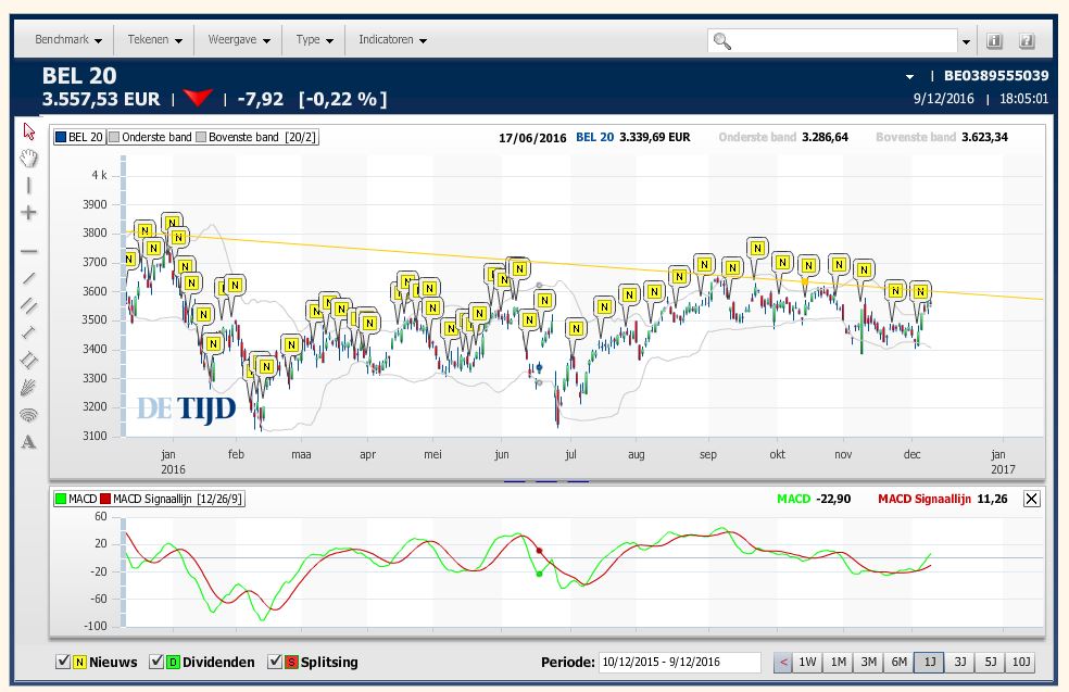 ![]() uiteindelijk zitten we al een eind in een soort zijwaarts, licht neergaand kanaal met de bel20 (ik volg andere indexen weinig omdat ik de bedrijven erin te weinig kan volgen) Als je de bollingerbands bekijkt zitten we nu weer tegen de top. Als er opeens iets is om er doorheen te breken, kan het weer een stuk hoger. Dat lijkt de MACD ook te ondersteunen. Alleen loop je daar dan snel tegen de dalende toppenlijn als weerstand. Ik denk eerder dat de beurs nog een tijdje verder zal slabakken en redelijk zijwaarts zal bewegen. En daarbij gaan we wel weer een aantal dagen eens stijgen, dan weer een aantal dagen dalen. Tot er ergens doorheen de langere termijn steunen of weerstanden wordt gebroken.