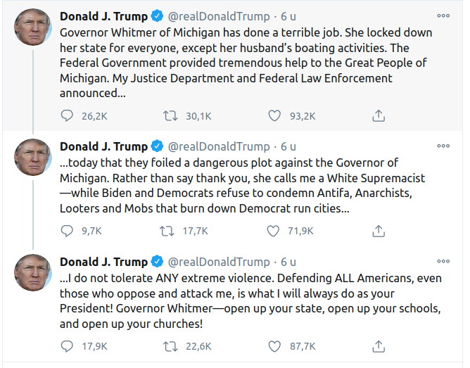 2. Natuurlijk zijn het Trump aanhangers. Het is een direkt gevolg van de haatspeeches van Trump tegen oa de gouverneur van Michigan. Hij heeft op het debat met Biden zelfs openlijk gezegd dat de extreemrechtse milities zoals Proud Boys zich 'moeten klaarmaken voor de strijd'.
