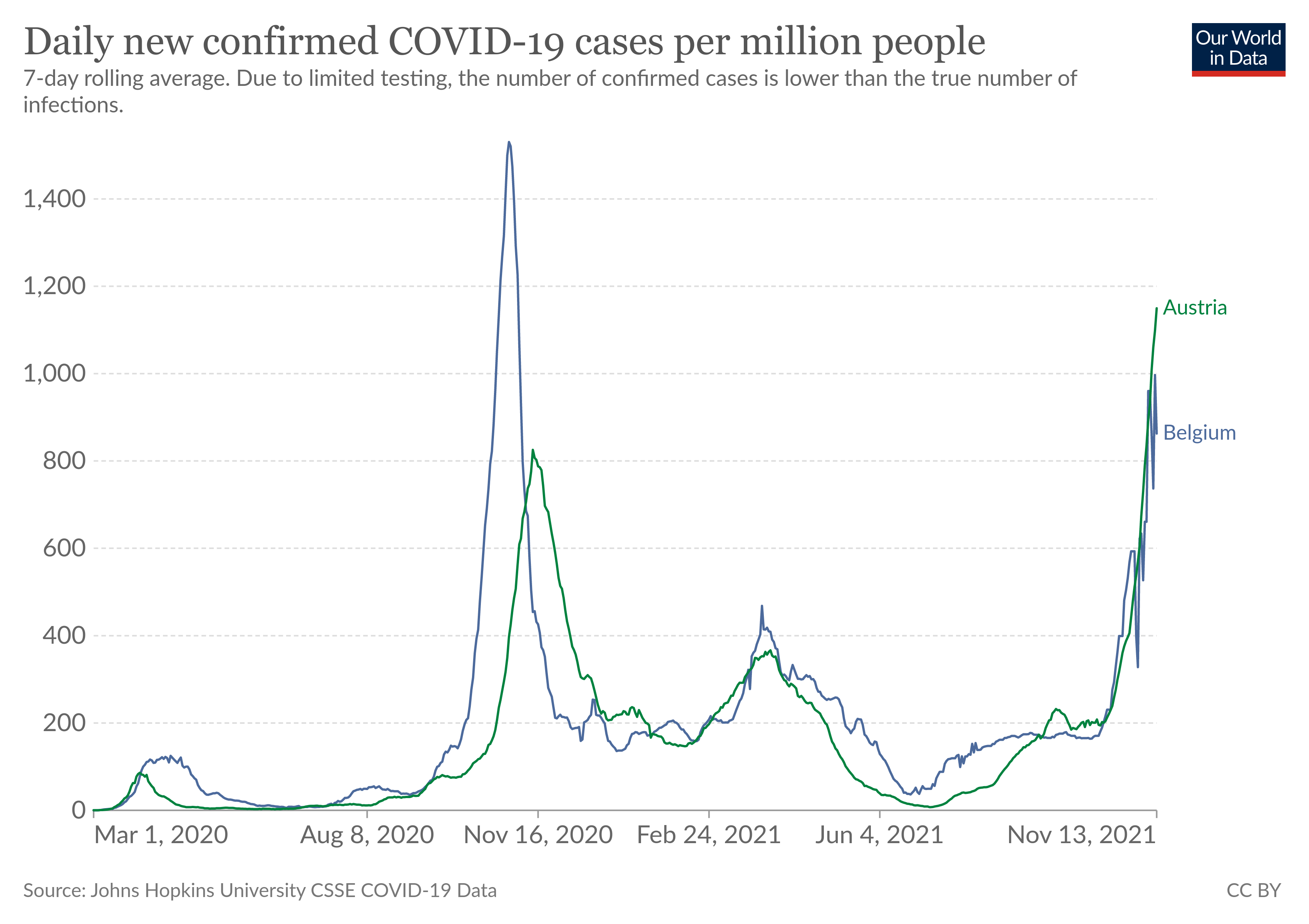 Citaat: Oostenrijk voert maandag een lockdown in voor mensen die niet volledig zijn gevaccineerd tegen COVID-19. Dat is de uitkomst van topoverleg tussen bondskanselier Alexander Schallenberg en leiders van deelstaten. De ingrijpende maatregel heeft gevolgen voor miljoenen mensen boven de twaalf jaar. Vandaag beslissen, morgen uitvoeren. Probeer dat in België maar eens. Het 2G-model. Tegenwoordig moet je meer schrik hebben van 2G dan van 5G. |