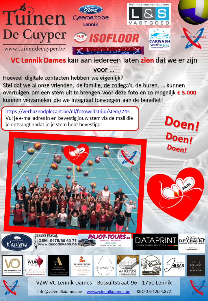 Haar strijd tegen de bacterie had tot gevolg dat er niet genoeg bloed en zuurstof naar haar handen en voeten ging, waardoor haar onderbenen en enkele vingers deels moesten worden geamputeerd. Er volgt nog een lange revalidatie. VC Lennik Dames wil heel graag dat herstel blijvend ondersteunen … door de verkoop van de supportssjaal, het organiseren van deze benefiet, en door wat zeker nog gaat komen. VC Lennik Dames kan aan iedereen laten zien dat we er zijn voor … Hoeveel digitale contacten hebben we eigenlijk? Stel dat we al onze vrienden, de familie, de collega’s, de buren, … kunnen overtuigen om een stem uit te brengen voor deze foto en zo mogelijk € 5.000 kunnen verzamelen die we integraal toevoegen aan de benefiet! https://verbazendplezant.be/nl/fotowedstrijd/stem/243 Vul je e-mailadres in en bevestig jouw stem via de mail die je ontvangt nadat je je stem hebt bevestigd