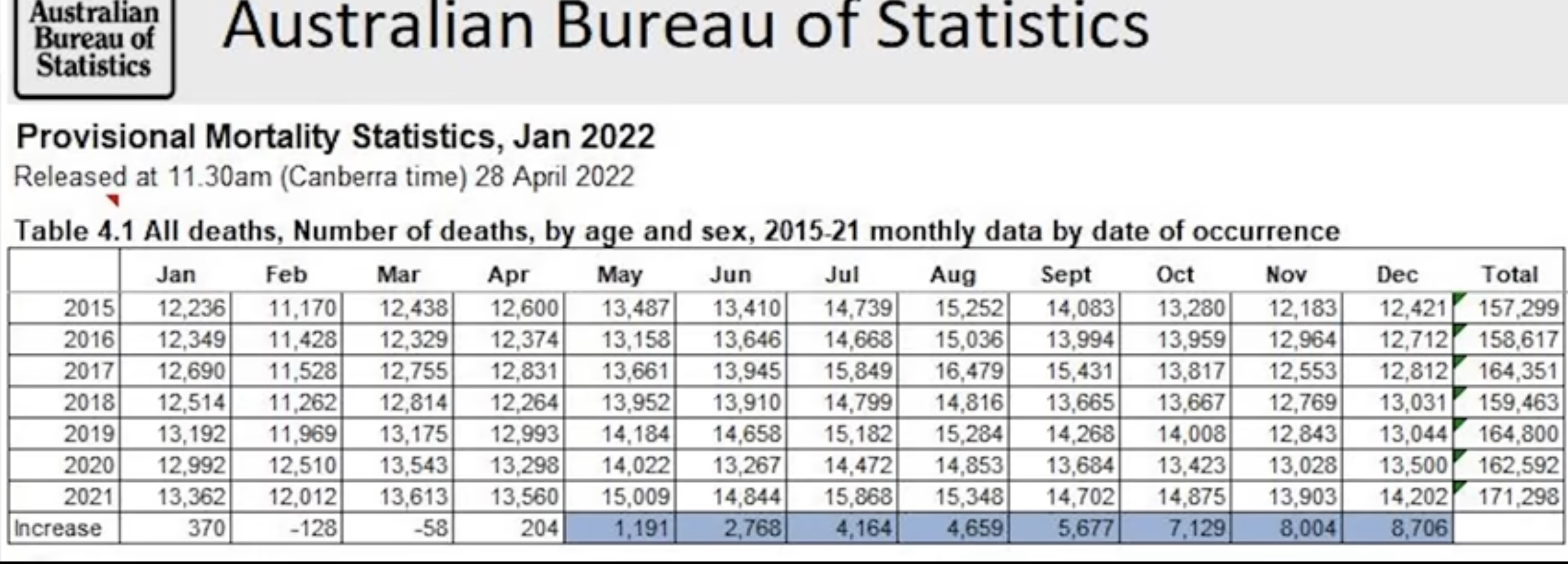 In 2021 was er nog geen covid in Australië vanwege hun gesloten grenzen, er werd wel gevaccineerd en toen zagen ze een oversterfte van 10% in die maanden ofte 10.000 mensen in totaal. Covid zou pas doorbreken in 2022 dus lijkt het er dus op dat de vaccins een grote oversterfte veroorzaken. Het zijn ook ongeveer dezelfde oversterfte cijfers dat we zien in 2022 alhier wanneer er geen covid sterfgevallen meer waren maar wel vaccinaties. Ter vergelijking, oversterfte van covid-19 was hier iets van 10-15% in 2020. Deze cijfers beginnen nu wel erg belastend te worden, er is eigenlijk geen andere verklaring voor deze oversterfte dan de covid vaccins. https://youtu.be/UR1X9O2lMlA |