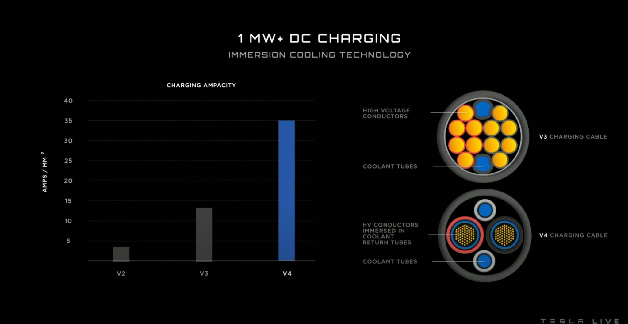 De accucellen zijn ~1000 VDC geschakeld, juiste bruikbare capaciteit heb ik nog niet gevonden, wslk 850 tot 950 kWh? (mogelijk 1 MWh) In elk geval wordt er gespaard aan bedradings-gewicht, welke type cellen grootte-chemie-Wh/l/kg en hoe ze verder gewicht sparen aan de verpakking en koelingsdesign van die accucellen weten we nog niet. https://www.teslarati.com/tesla-semi...ain-confirmed/ (andere e-vrachtwagens lange afstand zullen die 1kV wslk ook krijgen, maar Tesla is de eerste met 1000 VDC. (Lucid heeft 900 V in zijn limousine, andere EV tot 800, in de regel heeft het gros 400 V) Opgeladen wordt voorlopig aan 1 MW DC ( 1000V*1000 A), aan de 1,5 MW laadpunten V4. Vergelijk van de plugdoorsnede en design vloeistofkoeling V3 (250 W) versus V4 ( 1MW): zie figuur in link, of jpg-venster onderaan (ook Amps/mm²) De Cybertruck zal blijkbaar mogelijk ook 800 tot 1000 V geschakelde accucellen krijgen, want kan ook aan de V4 lader laden: https://www.teslarati.com/tesla-cybe...compatibility/ Het uitleverings-event: https://www.teslarati.com/tesla-semi...st-deliveries/