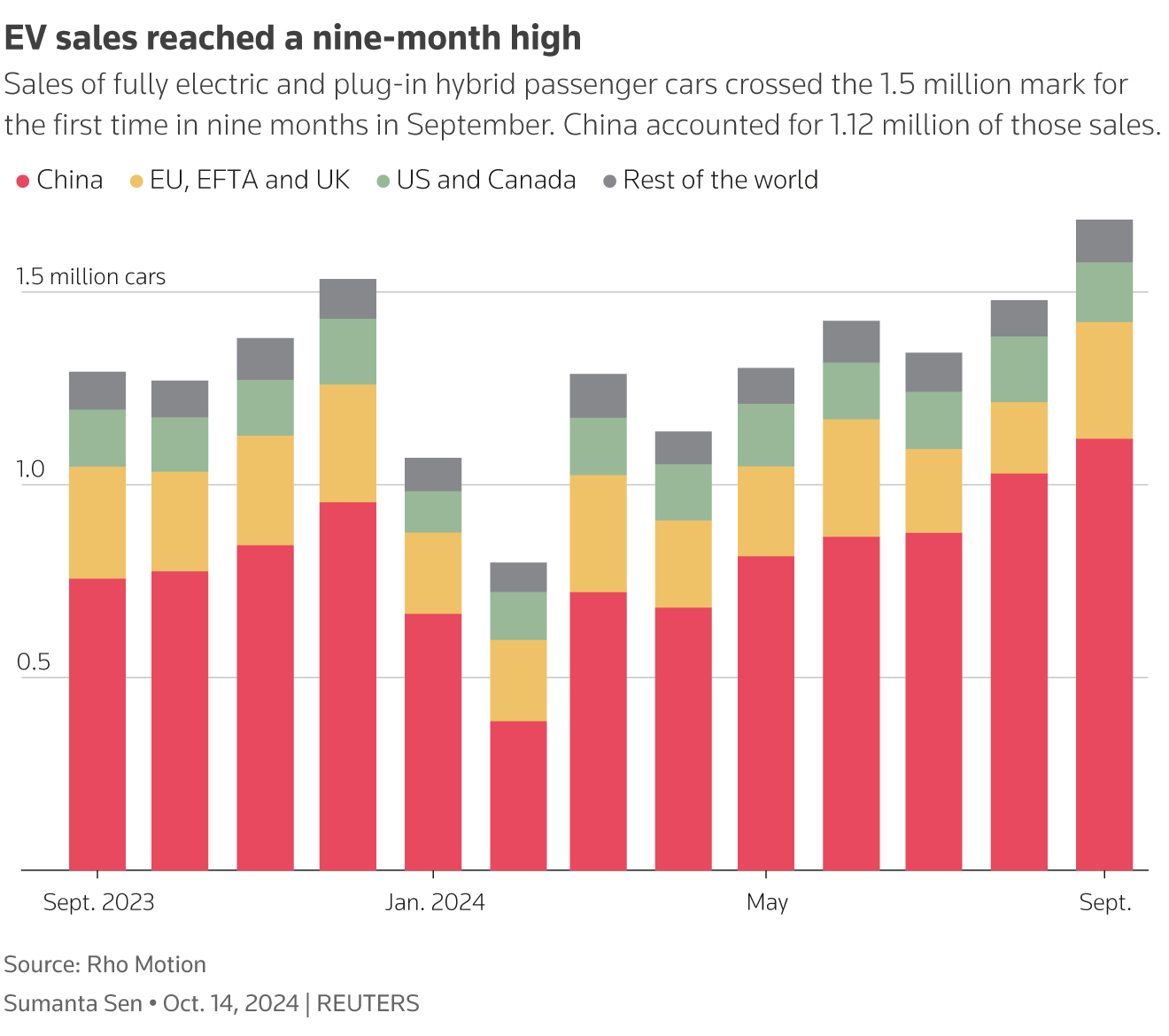 In september werden 1,12 miljoen stekkerwagens verkocht in China, dit van de 1,69 miljoen wereldwijd, meldt Reuters.