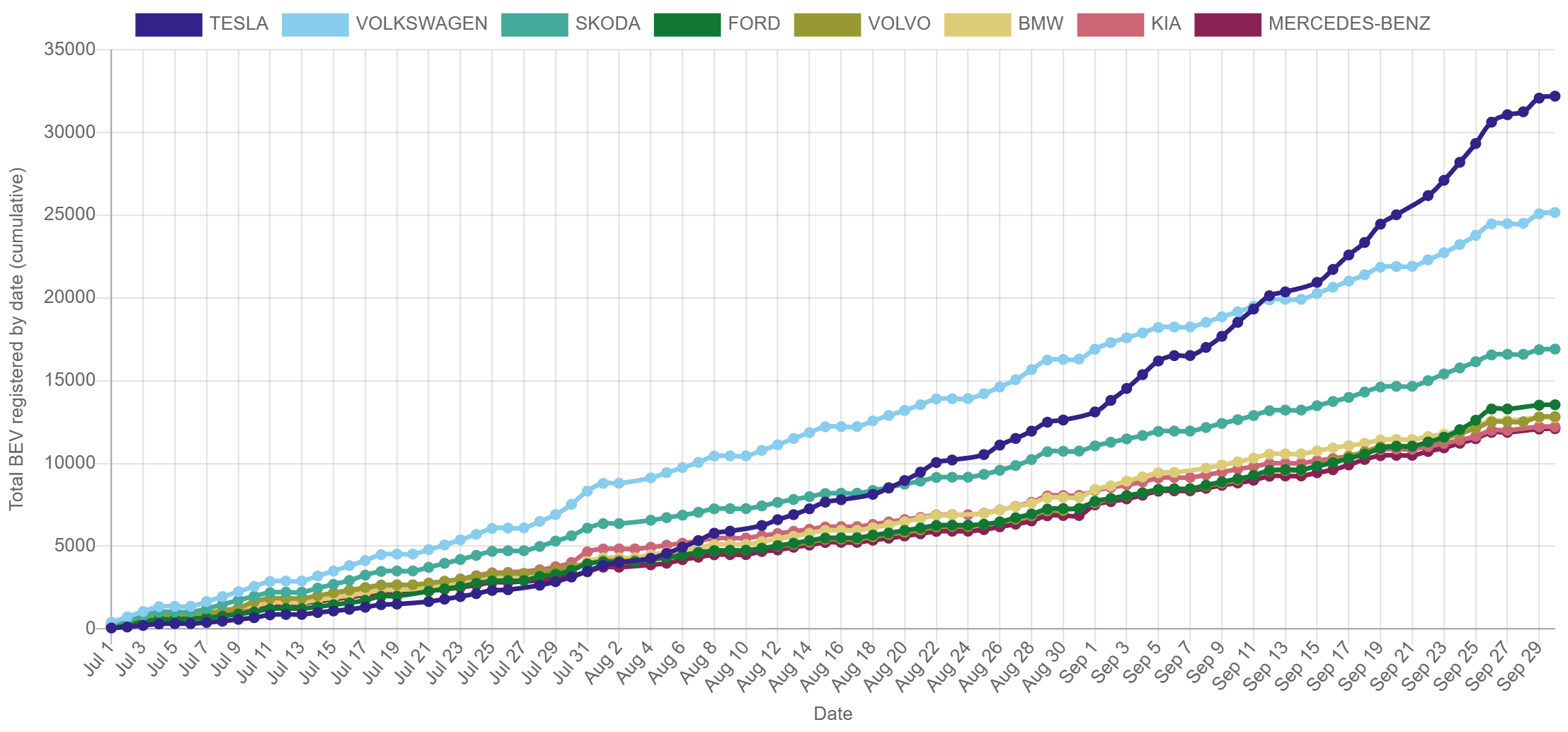 Tesla is goed op weg dit kwartaal Volkswagen in te halen bij deze 6 Europese landen (de enige waar dagelijkse cijfers van zijn) Dit met enkel 2 modellen (Y en 3) En er nog altijd gewacht wordt op nieuws van het compacte model 2. (uitgesteld wegens robotaxi) Men ziet dat Tesla zelfs buiten de top 8 viel in juli, maar dan augustus..., en dan september... Best sellers for Q3 - 2025 (showing top 8), cumulative registrations by days. Countries: DK ES GB NL NO SE