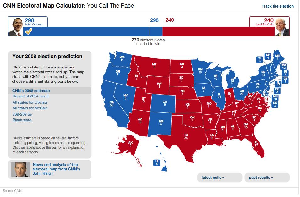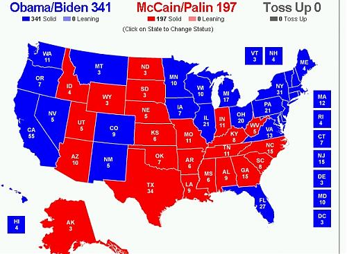 Obama wint: CA, CO, CT, DC, DE, FL, HI, IA, IL, MA, ME, MD, MI, MN, NH, NJ, NM, NV, NY, OR, PA, RI, VA, VT, WA, WI = 318 McCain wint: AK, AL, AR, AZ, GA, ID, IN, KS, KY, LA, MO, MS, MT, NC, ND, NE, OH, OK, SC, SD, TN, TX, UT, WV, WY = 220 |