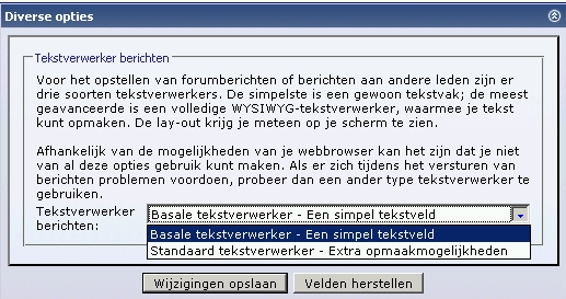 Ik ging er namelijk van uit dat, mocht de moderatie daadwerkelijk jouw opties op het forum willen beperken, ze wel slim genoeg zullen zijn ook je algemeen bekende dubbelnick op gelijkaardige wijze aan te pakken. Nu, in de veronderstelling dat je voor tony46 dezelfde browser als voor duveltje382 gebruikte, kunnen we mijn Javascript hypothese uitsluiten. Blijft wat IronChef suggereerde: de opties. Kijk eens onderaan in jouw opties (als duveltje382) naar het volgende: Als je de eerste optie kiest ("Basale tekstverwerker"), dan vallen de meeste opmaakfaciliteiten inderdaad weg. Kies een andere optie, en zie dan of het probleem zich nog stelt. Mocht ook dit niet helpen, dan zou het sportief zijn dat een mod ofwel 1) bevestigt dat er beperkingen op jouw account zitten (wat ik ten zeerste betwijfel) ofwel 2) eens kijkt waar het probleem aan zou kunnen liggen.