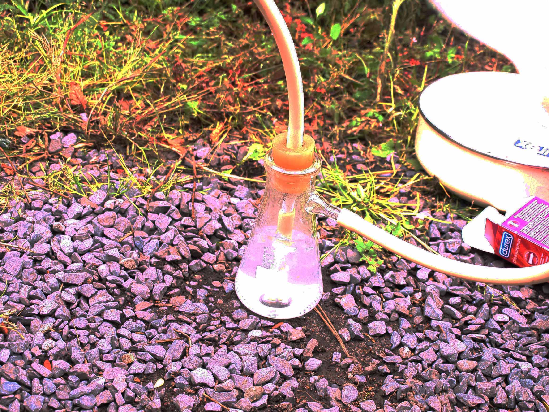 Ik blaas Durex pleasuremax condooms (die dikke met ribbeltjes) op met waterstofgas en laat ze de lucht in met een hartvormig kaartje aan, waarop ik de liefde voor mijn vriendin betuig. Waterstofgas maak ik als volgt: volgens de tekening in de bijlage, in de ene fles voeg ik aluminiumfolie en natronloog (gootontstopper). Deze is afgesloten via een rubber stop met een gat in, waar een rubber buis uit vertrekt naar een afzuygfles. Het gas wordt aldaar door water geleid om het af te koelen (Al + NaOH is exotherme reactie) en loog-bevattende aerosol weg te wassen. Aan de afzuygtuyt hangt dan weer een dikke rubberen slang, waar ik dan mijn condoom aan kan vasthechten. In nog geen twee minuten heb je die vol waterstof geblazen. Enkel nog dichtknopen en een kaartje aan binden. Wel geen sigaretjes roken in de nabijheid want die ballon is vrij explosief (mini-Hindenburg ![]() Zo heb ik er al acht vandaag richting 'Olland gestuurd (sterke zuiderwind hier). ![]() |