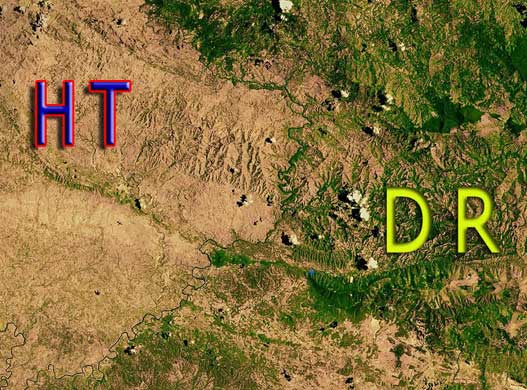 Links, Haïti, bruin vanuit de lucht Rechts, de Dominicaanse Republiek, groen vanuit de lucht.