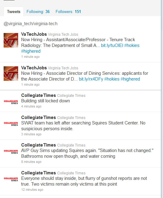 http://www.vt.edu/ https://twitter.com/#!/virginia_tech/virginia-tech http://www.radioreference.com/apps/a...wp&feedId=9365 =police scanner (server vrij belast, +7000 luisteraars momenteel) http://www.rentadrone.tv/cnn-live-stream/ Police investigating shootings on campus; shooter's status unknown (Posted: 1:49 p.m.) Shortly after noon today, a Virginia Tech police officer stopped a vehicle on campus during a routine traffic stop in the Coliseum parking lot near McComas Hall During the traffic stop. the officer was shot and killed. There were witnesses to this shooting. Witnesses reported to police the shooter fled on foot heading toward the Cage, a parking lot near Duck Pond Drive. At that parking lot, a second person was found. That person is also deceased. Several law enforcement agencies have responded to assist. Virginia State Police has been requested to take lead in the investigation The status of the shooter is unknown. The campus community should continue to shelter in place and visitors should not come to campus. |