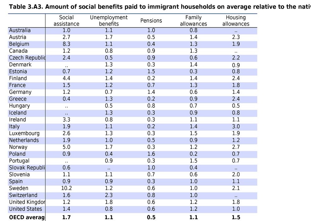 ''''Depending on the assumptions made and the methodology used, estimates of the fiscal impact of immigration vary, although in most countries it tends to be small in terms of GDP and is around zero on average across OECD countries.Immigrants tend to have a less favourable net fiscal position than the native-born, but this is almost exclusively driven by the fact that immigrant households contribute on average less in terms of taxes and social security contributions than the native-born and not by a higher dependence on benefits. Employment is the single most important determinant of migrants’ net fiscal balance, particularly in countries with comprehensive social protection systems.''''