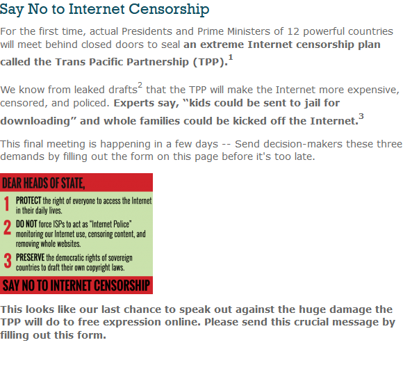 Onze (online) vrijheden worden andermaal bedreigd door censuur! http://www.publicknowledge.org/blog/whats-actually-tpp https://openmedia.org/censorship?utm..._campaign=apec